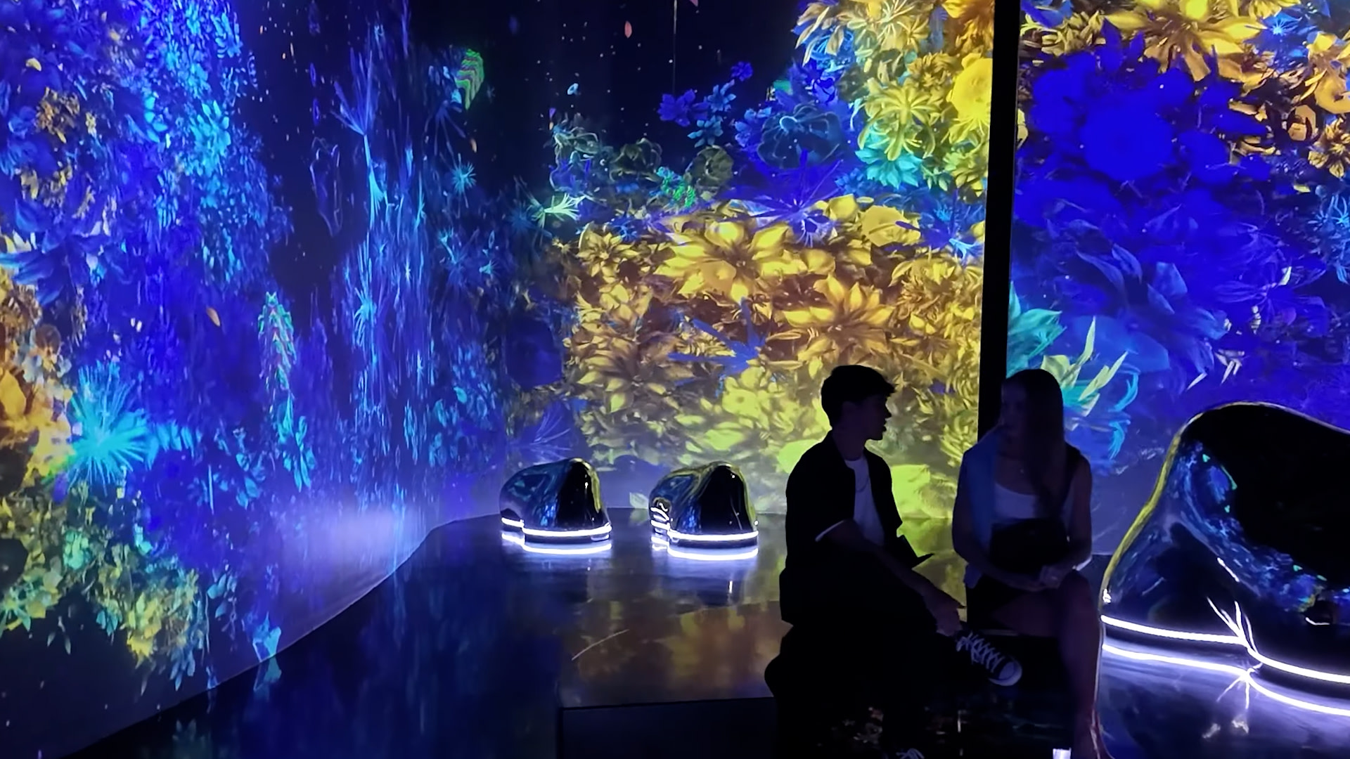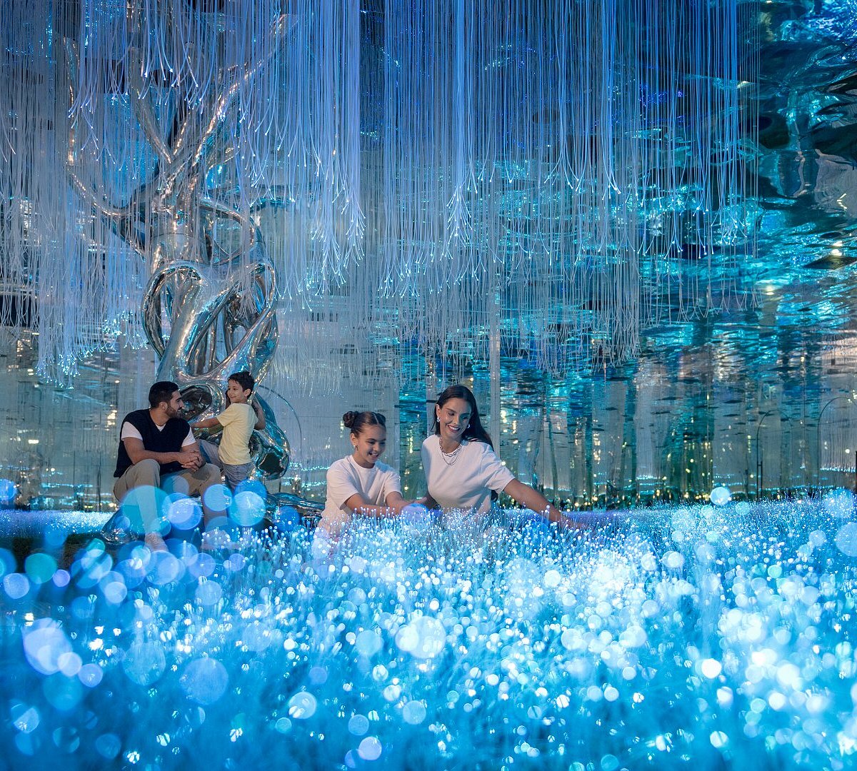 Each zone is designed to transport you to a different world — from the dreamy Flora Garden filled with glowing plants to The River, where light waves flow beneath your feet, and The Falls, where interactive projections make you feel part of a living artwork.