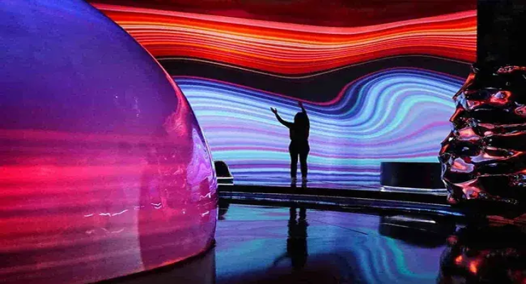 The AYA Universe (Ticket Only) experience begins the moment you step inside its neon-lit corridors. You’ll wander through stunning digital environments filled with shimmering lights, flowing waterfalls, and cosmic patterns that react to your movement.